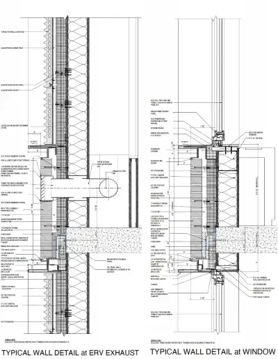 There are two distinct wall assemblies for the building: one that faces the street and one that faces the courtyard or abuts the rail control center to the east. The former (see details below) will be clad with either brick or terracotta panels that match the textual context and palette of the neighborhood. Beneath will be a 3-inch layer of continuous insulation (mineral fiber), an air and moisture barrier system, exterior sheathing, and then 6 inches of mineral wool insulation within the metal-framed walls. McFarland says that special steps are being taken to minimize thermal bridging. For example, wood blocking will be installed under the windows to receive the exterior metal sill trim. Meanwhile, the stems of the brick ties will be coated in plastic to prevent thermal bridges and a thermally-broken shelf angle support will be used to allow for continuous insulation behind the angle. The former product is manufactured by Hohmann & Barnard and the latter is manufactured by Fero.